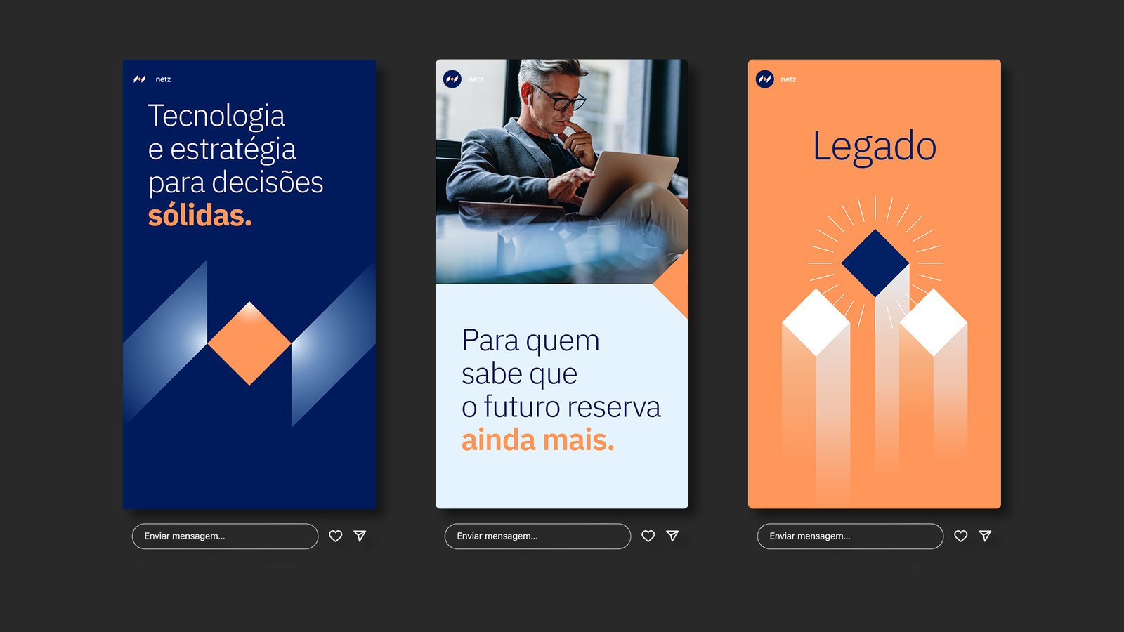 Alguns exemplos de como abordar a criação de peças de comunicação de Netz em diversos pontos de contato para construir uma marca forte e proprietária.